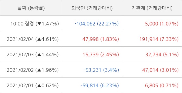 오늘 외국인은 한화에어로스페이스를 10만 4062주 순매도 하고 기관은 5000주 순매수 하는 것으로 잠정 집계되고 있다. 최근 5일 동안 개인 투자자들은 23만 5266주 순매도 했고, 외국인과 기관은 각각 1만 7707주 순매도, 24만 5753주 순매수 했다.