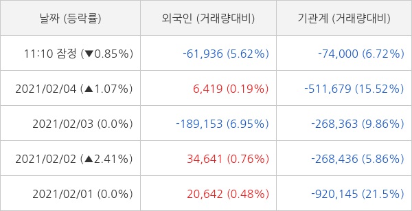 오늘 외국인은 한국전력을 6만 1936주 순매도 하고 기관은 7만 4000주 순매도 하는 것으로 잠정 집계되고 있다. 최근 5일 동안 개인 투자자들은 247만 7812주 순매수 했고, 외국인과 기관은 각각 43만 539주 순매도, 212만 3761주 순매도 했다.