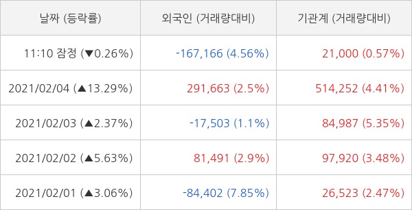오늘 외국인은 한국항공우주를 16만 7166주 순매도 하고 기관은 2만 1000주 순매수 하는 것으로 잠정 집계되고 있다. 최근 5일 동안 개인 투자자들은 87만 3394주 순매도 했고, 외국인과 기관은 각각 12만 120주 순매수, 75만 5835주 순매수 했다.
