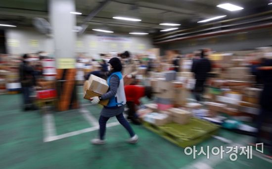 설 명절 연휴를 이틀 앞둔 9일 서울 송파우체국 지하주차장에 마련된 우편물 임시 분류소에서 관계자들이 분류작업을 하고 있다./김현민 기자 kimhyun81@