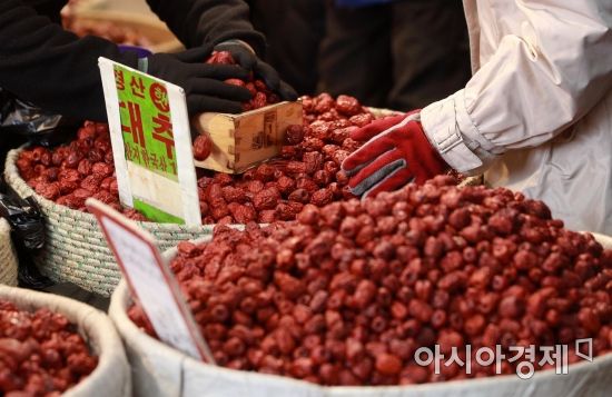 설 연휴를 하루 앞둔 10일 서울 동대문구 경동시장에서 한 상인이 소쿠리 가득 대추를 담고 있다./김현민 기자 kimhyun81@