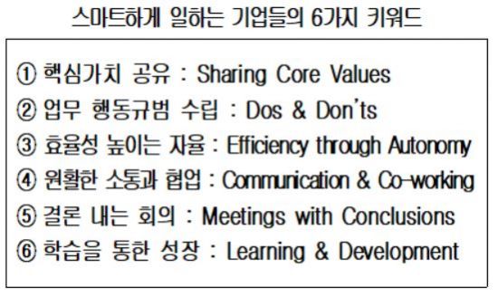 자율부여를 통한 효율성 증대도 스마트하게 일하는 비결로 꼽혔다. 명확한 이유가 없는 암묵적인 규범이나 정해진 시간과 장소에서 근무를 해야 한다는 고정관념을 이제는 버려야 한다는 것이다.