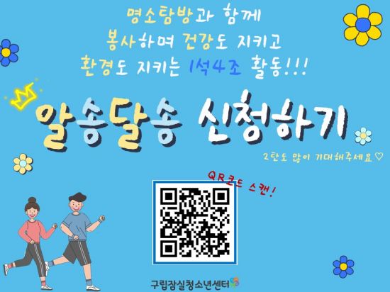 구립잠실청소년센터에서 운영하는 '언택트 송파탐방 알송달송'은 '알면좋은 송파명소 달려보자 송파명소'라는 의미를 담아 송파둘레길, 석촌호수 공원 등 지역내 명소를 즐기는 동시에 플로깅을 통해 환경정화활동을 하는 프로그램이다.