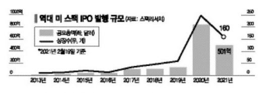 올해는 스팩 열풍이 더욱 거세질 전망이다. 스팩리서치에 따르면 올 들어 두달도 채 되지 않는 기간에 스팩을 통한 증시 입성은 총 160건(2월19일 기준)으로, 총 501억달러를 모았다.