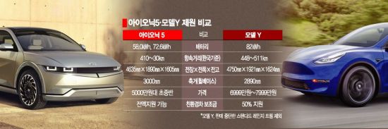 항속거리는 배터리 용량이 82㎾h에 달하는 모델Y가 58.0㎾h~72.6㎾h인 아이오닉 5를 앞선다. 모델Y의 항속거리는 448~511㎞다. 반면 아이오닉 5는 410~430㎞로 다소 짧다. 출력도 격차가 있다. 모델Y는 384마력(롱레인지 기준)의 출력을 내지만 아이오닉 5는 225마력(4륜 구동 프레스티지 기준)이다. 제로백(정지 상태에서 시속 100㎞까지 도달하는 시간)은 아이오닉 5가 5.2초이지만 모델Y는 4.2초로 조금 앞선다.
