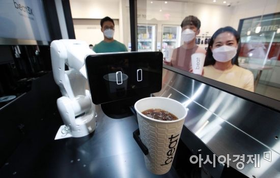 3일 경기 성남 분당구 다날 본사에서 진행된 ‘비트3X 론칭 기념 미디어데이’에서 3세대 커피 로봇이 적용된 무인 매장 플랫폼 비트박스(b;eat box)가 공개되고 있다. 다날의 푸드테크 기업 비트코퍼레이션은 이날 미디어데이를 통해 미래형 리테일 플랫폼 비즈니스의 새로운 기준과 향후 사업 비전을 소개했다./성남=김현민 기자 kimhyun81@