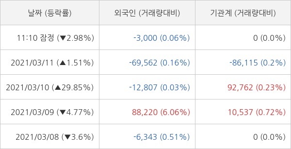 오늘 외국인은 3000주 순매도 하는 것으로 잠정 집계되고 있다. 최근 5일 동안 개인 투자자들은 9706주 순매수 했고, 외국인과 기관은 각각 9442주 순매수, 1만 7184주 순매수 했다.