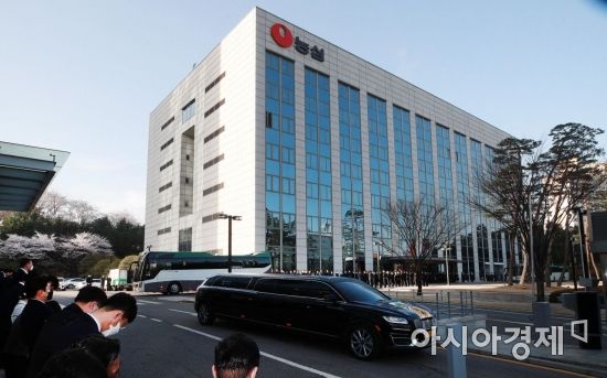 농심 창업주 고 신춘호 회장의 영결식이 엄수된 30일 고인의 영정을 앞세운 운구행렬이 서울 동작구 농심 본사를 떠나 장지로 향하고 있다. 고인은 롯데그룹 창업주인 고 신격호 롯데그룹 명예회장의 둘째 동생으로, 지난 1965년 농심을 창업해 신라면과 짜파게티 등 국민적 사랑을 받는 제품을 개발했다./김현민 기자 kimhyun81@