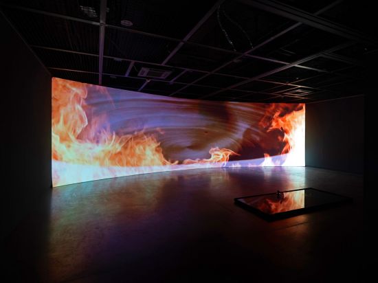 2층 가장 안쪽의 넓은 공간에는 ‘Beyond(2021)’가 설치돼 있다. 이곳으로 들어서면 가로 11m, 높이 2.7m의 커브드 화면 속에 불꽃이 이글거리고 있다. 불꽃 한가운데서 토기(土器)가 시계 방향으로 회전한다. 마른 장작이 타들어가는 소리도 들린다. 화면 앞쪽 바닥엔 문이 눕혀져 있다. 그 위로 천장에서 떨어지는 물방울들이 작은 파면(波面)을 계속 만들어낸다. 마스크를 은은하게 파고들 정도의 냄새도 전해진다. 작가가 직접 전문업체에 의뢰해 숯으로 만든 향수다.