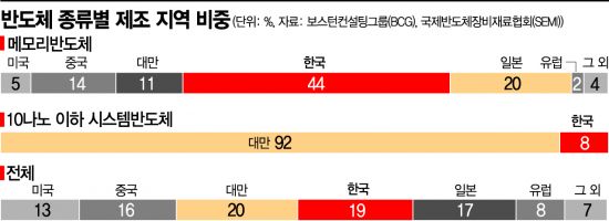 미국 반도체산업협회(SIA)와 보스턴컨설팅그룹(BCG)이 1일(현지시간) 국제반도체장비재료협회(SEMI) 자료를 기반으로 분석한 바에 따르면 한국은 2019년 기준 전체 반도체 생산 중 19%의 비중을 차지해 대만(20%)에 이어 2위인 것으로 나타났다. 메모리 반도체에서는 한국이 점유율 44%로 압도적 1위지만 시스템 반도체로 불리는 비메모리 반도체 분야에서는 입지가 약해 대만이나 미국, 유럽, 중국, 일본 등에 밀린다. 이재용 삼성전자 부회장이 ‘2030년 시스템 반도체 세계 1위’를 목표로 내걸었지만 이를 달성하기 위해 따라잡아야 할 격차는 아직 크게 남아 있다.