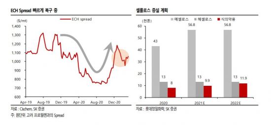 그린소재 셀룰로스는 올해 상반기 증설을 앞둬 총 6만4000t에서 하반기 8만t으로 25% 확대될 전망이고, 나무 펄프가 기반인 만큼 친환경 트렌드에도 부합한다는 평가다. 의약품과 대체육이라는 새로운 시장 진입이 예상된다. 박한샘 SK증권 애널리스트는 "고마진 이익 기여는 점차 확대될 전망"이라며 "롯데정밀화학이 보유한 50% 시장점유율의 암모니아 분야는 그린수소라는 방향성에 퍼즐 조각을 맞출 수 있어 사업 확장 측면의 기회 요인"이라고 전망했다.