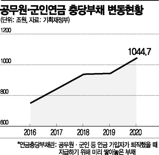 6일 기획재정부에 따르면 정부가 이날 국무회의에서 의결한 2020회계연도 국가결산보고서상 연금충당부채는 1044조7000억원으로 1년 전보다 100조5000억원 증가했다. 증가폭으로는 2013년 회계연도(159조4000억원)에 이어 역대 두 번째로 컸다. 연금충당부채 평가 방식이 ABO(누적 급여채무)→PBO(예측 급여채무)로 바뀐 2013년 이후를 비교하면 사실상 역대 최대치다. 연금충당부채는 공무원·군인연금 수혜자에게 앞으로 지급해야 할 미래의 연금액을 현재 가치로 환산한 금액이다. 연금 액수는 임금 상승률과 소비자물가 상승률 정도에 따라 변동이 생길 수 있다.