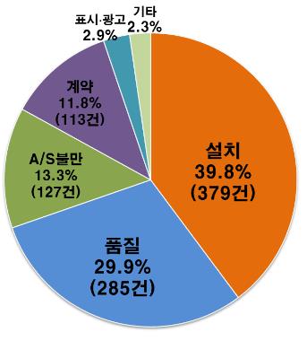13일 한국소비자원이 2018년부터 지난해까지 접수된 에어컨 관련 피해 구제 신청 954건을 분석한 결과에 따르면 사업자의 설치 미흡에 따른 누수나 설치비 과다 청구 등 '설치' 관련 구제 신청이 39.8%로 가장 많았다. 이어 냉방 불량이나 소음, 악취 등 '품질' 관련이 29.9%, 수리 불만족, 수리 비용 과다 청구 등 사후서비스(AS) 불만 관련이 13.3%를 차지했다.