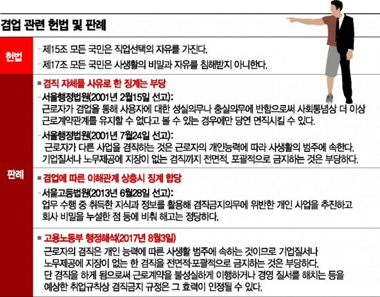 법적으로 근로자의 겸직을 포괄적·원칙적으로 금지하는 것은 위헌 소지가 크다. 정종철 김앤장 법률사무소 변호사는 "겸업금지는 헌법상의 직업선택의 자유를 침해한다"며 "법적으로 무효로 봐야 한다"고 지적했다. 헌법 제15조는 ‘모든 국민은 직업선택의 자유를 가진다’, 제17조는 ‘모든 국민은 사생활의 비밀과 자유를 침해받지 아니한다’고 명시하고 있기 때문이다.