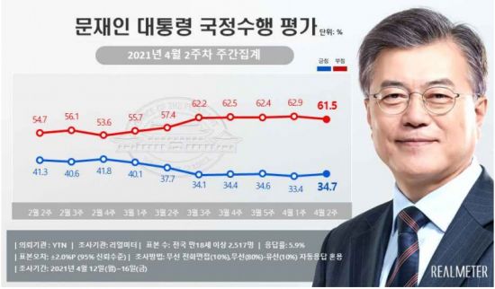 여론조사 기관 리얼미터가 YTN 의뢰로 지난 12~16일 전국 18세 이상 유권자 2517명을 대상(응답률 5.9%, 표본오차 95% 신뢰 수준에 ±2.0%포인트)으로 조사한 결과, 대통령 국정수행 지지율(긍정평가)은 전주 주간집계 대비 1.3%포인트 오른 34.7%로 집계됐다. 부정 평가도 전주 대비 1.4%포인트 내려 61.5%를 기록했다. 직전 조사였던 4월 1주(5~9일) 때 국정수행 지지율은 33.4%로 집권 후 최저치를 기록한 바 있다. 배철호 리얼미터 전문위원은 "지지율이 반등했다기보다 하락세가 멈췄다는 것이 정확한 표현"이라며 "16일 개각 영향은 좀 더 지켜봐야 한다"라고 말했다.