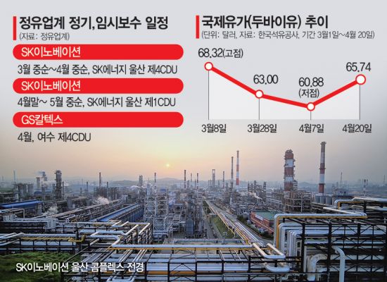 21일 업계에 따르면 SK에너지는 울산 제1 원유정제시설(CDU)의 임시보수를 한 달 앞당겨 이달 말부터 실시한다. 제1CDU 처리용량은 하루 6만배럴이다. SK에너지는 현재 제4CDU(일산 24만배럴)도 정기보수 중이다. GS칼텍스도 지난달부터 일산 33만 배럴 규모의 여수 제4CDU 정기보수를 진행하고 있다. 에쓰오일(S-OIL)과 현대오일뱅크는 지난해 정기보수를 앞당겨 실시했으며, 올해 예정된 정기보수는 없는 것으로 알려졌다.