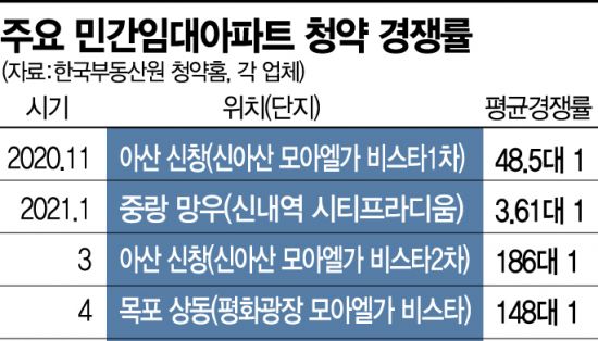 지난 9일부터 12일까지 온라인 청약을 진행한 전남 목포시 ‘평화광장 모아엘가 비스타’도 상황은 비슷했다. 217가구 공급에 신청은 3만2118건에 달해 148대1의 경쟁률을 나타냈다. 이밖에 연초 서울 중랑구 망우동에서 공급된 ‘신내역 시티프라디움’ 역시 943가구에 3408명이 신청해 청약이 조기 마감됐다.