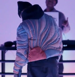 그가 당시 입었던 패딩은 빨간색 반원을 중심으로 주황색·분홍색 등 붉은 계열의 곡선이 길게 뻗어나가는 이미지로 디자인된 의상이었다.