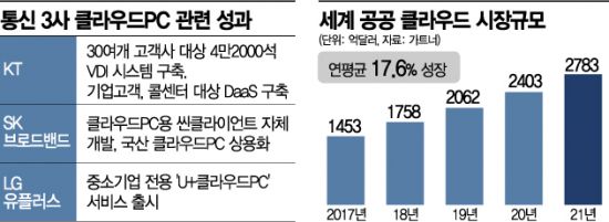 [아시아경제 차민영 기자] 코로나19 이후에도 스마트워크가 확산하면서 통신 3사가 클라우드PC 시장을 두고 물밑 전쟁을 벌이고 있다. 재택근무와 스마트워크 확산, 디지털 뉴딜 정책 시행으로 금융권과 공공 부문 수요가 크게 늘었기 때문이다. 보안 문제로 망분리가 의무화 된 상황에서 클라우드PC는 업무 효율성을 높여주는 신기술로 꼽힌다.