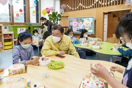 이 날에는 아이들이 어린이날을 맞아 케이크를 만드는 시간을 가졌으며, 김선갑 구청장도 함께 참여하며 훈화를 전했다.