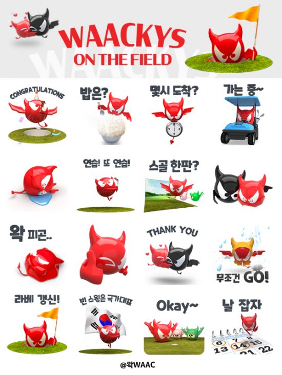 왁이 이번에 출시한 이모티콘은 골퍼들에게 활용도 높은 총 16종의 아이템을 구성한 것이 특징이다. 골퍼들에게 일어날 수 있는 다양한 스토리를 배경으로 ‘빈 스윙은국가대표’, ‘라베(라이프 베스트 스코어) 갱신!’, ‘스골(스크린골프) 한판!’ 등 재치 있는 이모티콘을 선보였다.