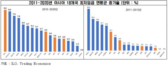 2011~2015년 한국은 연평균 상승률이 6.6%로 아시아 18개국 중 8개국으로 중간 수준이었다. 같은 기간 중 라오스, 캄보디아, 베트남 등의 급격한 최저임금 상승으로 기간 중 18개 아시아 국가의 평균 최저임금 연평균 상승률은 8.3%를 기록했다. 중국도 저소득계층 소득향상 정책에 따라 12.1%를 기록했다.