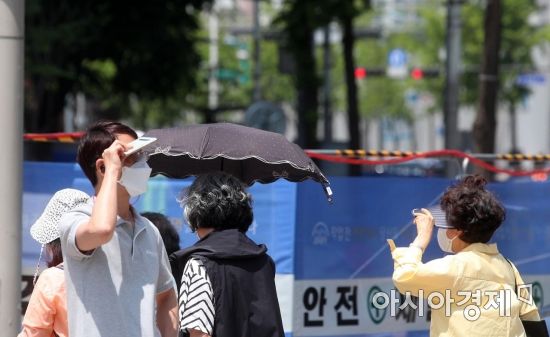 서울의 한낮 기온이 29도까지 오르며 초여름 더위가 이어진 13일 서울 송파구 거리에서 시민들이 양산과 모자 등으로 햇볕을 가리고 있다./김현민 기자 kimhyun81@