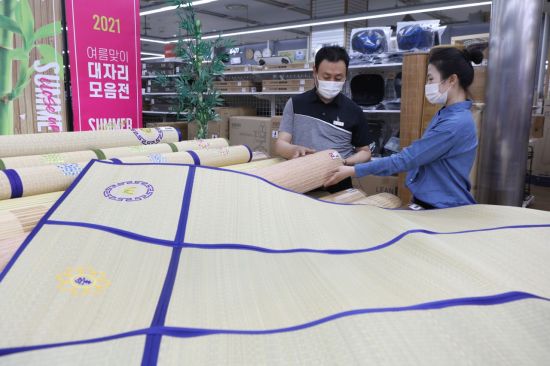 [아시아경제 호남취재본부 신동호 기자] 롯데마트 광주월드컵점 1층에서 다가오는 여름을 맞아 몸의 체온을 내려주고 쾌적한 잠자리에 도움을 주는 여름철 인기 아이템으로 각광 받는 대자리를 선보이고 있다. 여름철 자리의 종류로 대자리, 마작, 왕골, 왕대나무 등의 다양한 형태의 자리로 침대나 방바닥 위 그리고 의자나 소파에 깔아두고 사용하면 좋다.