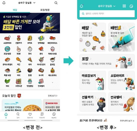 두드러진 특징은 첫 화면 구성이 서비스를 중심으로 재편됐다는 점이다. 본래 배민의 첫 화면은 음식을 카테고리별로 정렬해 노출하는 소위 '메뉴판식' 구성이었다. 하지만 배민이 앱 내에서 신규 서비스들을 출시하며 이용자들 사이에서는 첫 화면을 사용하기 불편하다는 의견이 잇따랐다. 음식 메뉴 카테고리와 다른 서비스들이 한 화면에서 혼재된 까닭이다.