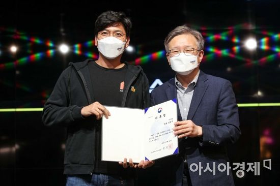 권칠승 중소벤처기업부 장관이 26일 서울 서초구 드림플러스강남점에서 열린 '컴업 2021 조직위원회 출범식'에 참석해 안성우 직방 대표에게 민간조직위원장 위촉장을 전달한 뒤 사진촬영 하고 있다./강진형 기자aymsdream@