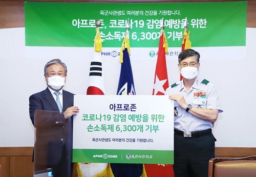 줄기세포 피부과학을 선도하는 전문기업 아프로존(회장 김봉준)이 지난 5월 코로나19 장기화로 인해 외출 및 대외활동이 축소된 육군사관생도들을 응원하고자, 전 사관생도를 비롯한 육군사관학교 내 장병, 교수들에게 손소독제 6,300개를 기증했다.