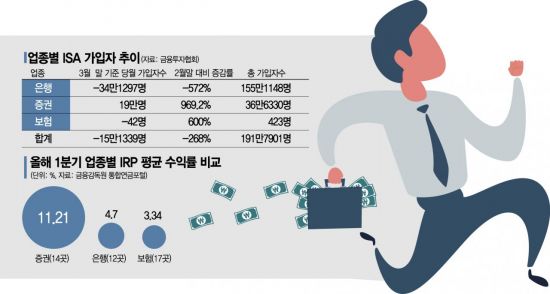 ISA 시장은 아직은 은행 가입자 및 가입 규모가 크다. 은행은 전체 가입자 191만7901명 중 80%인 155만1148명, 전체 가입금액 7조8155억원 중 86%인 6조7288억원을 차지하고 있다. 증권사와 비교하면 가입자 수는 4.2배, 가입금액은 6.1배 높다.