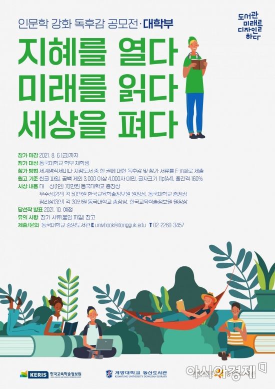 [아시아경제 한진주 기자] 동국대학교는 한국교육학술정보원(이하 KERIS), 계명대와 공동으로 8월6일까지 고등학생·대학생을 대상으로 '인문학 강화 독후감 공모전'을 개최한다.