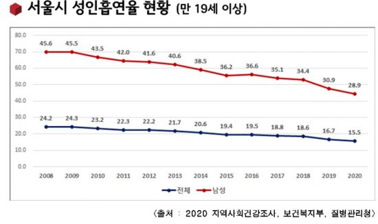 31일 서울시에 따르면 지난해 지역사회건강조사에서 서울시 성인남성 흡연율은 28.9%로 조사돼, 최초로 30% 이하로 떨어져 역대 최저 수치를 기록했다. 특히 청소년건강행태조사에서 청소년 흡연율도 3.4%로 떨어져 지난 3년간 5.7%를 유지하던 흡연율은 2.3%포인트 하락했다.