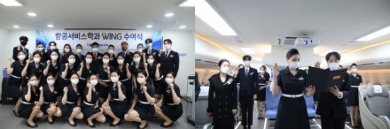 디지털서울문화예술대학교(총장 이윤석, 이하 서울문화예술대) 항공서비스학과가 지난 5월 26일(수) 항공비행실습실(Mock-up)에서 제1회 윙(Wing) 수여식을 개최했다. 윙 수여식은 예비 승무원으로 성장하기 위한 몸가짐과 바른 인성, 꿈을 다짐하는 행사다.