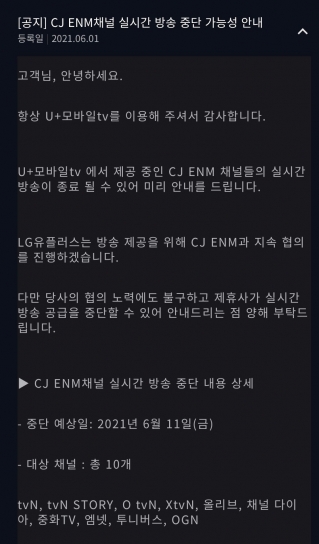 4일 관련 업계에 따르면 LG유플러스는 지난 1일자로 사용자들에게 오는 11일부터 자사 온라인동영상서비스(OTT)인 U+모바일tv에서 제공 중인 CJ ENM 채널의 실시간 방송이 종료될 수 있다고 안내했다. 대상 채널은 tvN, tvN 스토리, O tvN, 올리브, 엠넷, 투니버스 등 10개 채널이다. LG유플러스는 "방송 제공을 위해 CJ ENM과 지속 협의를 진행할 것"이라면서도 "노력에도 제휴사가 공급을 중단할 수 있어 안내 드렸다"고 설명했다.