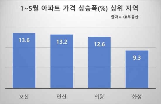 KB주택가격동향에 따르면 올해 1~5월 수도권 시(市) 중에서 오산(13.6%)이 세 번째로 높은 상승폭을 기록한 것으로 나타났다. 수도권 남부로만 좁히면 가장 높은 상승률이며, 서울(4.9%)과 수도권 평균(8.3%)을 크게 웃돈다. 안산(13.2%), 의왕(12.6%), 화성(9.3%) 역시 상승폭이 컸다. 이들 지역은 지난해 가격상승률 상위권에서 빠진 지역이어서 상승 잠재력이 높은 곳으로 꼽힌다.