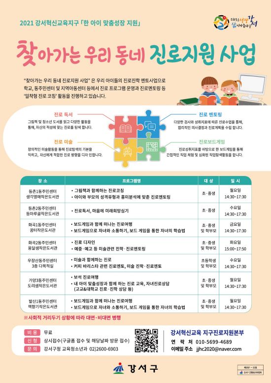서울 강서구(구청장 노현송)는 학교, 동주민센터, 지역아동센터에서 아이들의 진로진학 멘토가 되어 주는 ‘찾아가는 우리 동네 진로지원 사업’을 추진한다.