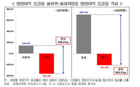 업종별 영업이익 증감률 격차도 확대됐다. 지난해 영업이익이 가장 큰 폭으로 늘어난 운송업(697.5%)과 가장 큰 폭으로 감소한 정유업(-205.0%) 간 영업이익 증감률 격차는 902.5%p로, 2019년 최상위, 최하위업종 간 격차인 508.2%p보다 확대됐다.