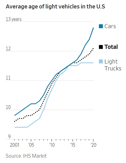 IHS 마킷의 토트 캄파우 이사는 자동차 가격이 오른데다 자동차 품질도 좋아져 미국인들이 점점 더 오랜 기간 자동차를 탄다고 설명했다. 그는 20년 전만 해도 보통 자동차 한 대의 주인은 1~2명이고 주행거리가 10만마일 정도가 보통이었는데 지금은 한 대당 차 주인이 여러 명이고 주행거리가 20만마일을 넘기는 경우가 점점 더 보편화되고 있다고 설명했다.