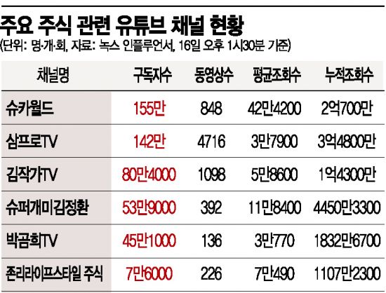 같은 기간 구독자 수가 가장 크게 증가한 것은 ‘삼프로TV 경제의신과함께(삼프로TV)’다. 삼프로TV의 구독자 수는 지난해 초 10만명 수준에서 현재는 142만명을 기록하고 있다. 1년6개월 만에 14배가 넘는 성장세다. 삼프로TV는 증시 관련 이슈를 김동환, 이진우, 정영진 3명의 경제 전문가가 각각 고수·중수·초보의 시각에서 다양하고 쉽게 풀어내고 있는 것이 개인투자자들의 발길을 이끄는 배경이다. 주식 시황부터 전문가 대담까지 폭넓은 주식 관련 정보를 간단하고 알기 쉽게 알려준다. 4700개가 넘는 영상들의 평균 조회수만 3만7900회, 누적 조회 수는 3억4800만회에 이른다. 이 외에도 김작가TV(80만4000명), 슈퍼개미 김정환(53만9000명), 박곰희TV(45만1000명), 존리라이프스타일 주식(37만6000명), 슈퍼개미 배진한 레스몬TV(21만1000명), 슈퍼개미 이세무사TV(16만1000명) 등의 주식 관련 유튜브 채널도 인기다.