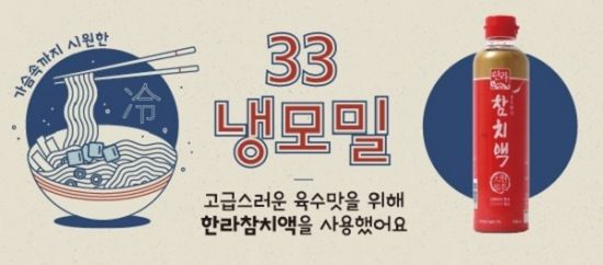 ‘33냉모밀’은 메밀의 함량을 높인 메밀면과 한라 참치액으로 맛을 낸 육수가 더 해져 시판 냉모밀의 고급화를 실현했다. 패키지 디자인 역시 레트로풍의 트렌디함을 더 해 남녀노소 누구에게나 친근함을 어필하고 있다.