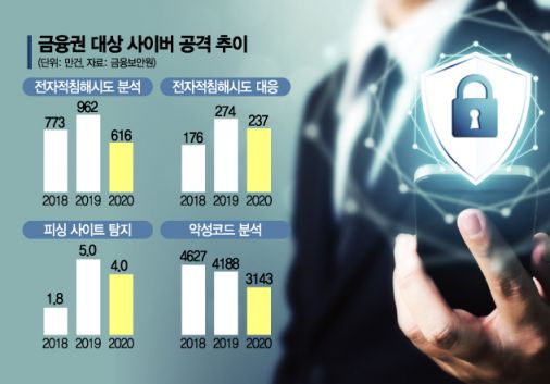 디지털 비대면 금융이 가속화되는 와중에도 ‘전자적 침해시도’가 줄어든 것으로 파악됐다. 첨단보안 기술 도입과 관계기관과의 협력, 내부 직원의 보안 의식 제고로 금융사의 디지털 대응 역량이 높아졌다는 분석이 나온다.