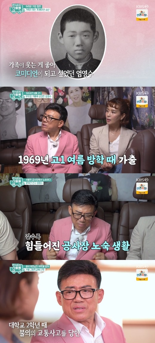 23일 오후 방송된 KBS 2TV 예능 프로그램 'TV는 사랑을 싣고'에는 엄영수가 출연, 고등학생 시절 신세를 진 친구를 찾는 모습이 그려졌다.