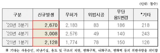 실제로 서울시에 따르면 올해 1분기 25개 자치구에서 건축법을 위반한 건축물은 총 2128건으로 나타났다. 이 중 위반 건축물 유형별로는 ‘무허가 건축’이 1774건(83%)으로 가장 많았다. 근생빌라와 같은 ‘무단 용도변경’이 150건(7%)으로 그 뒤를 이었다. 이행강제금은 총 37억원을 부과됐다.