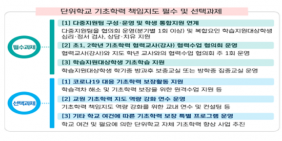 등교일수 부족 등으로 학습결손이 누적된 학생들을 위해 방학 중에는 공립 초등학교 293곳에서 기초학력 집중교실을 운영한다. 초등학교 1~6학년 학생을 대상으로 기초학력 집중 지도를 지원한다.