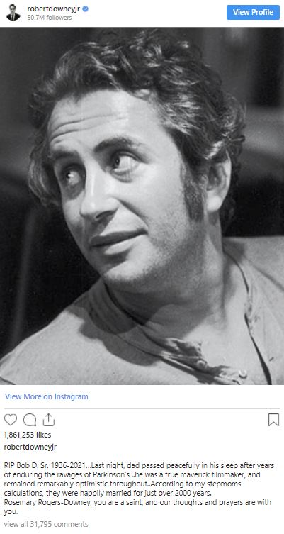 7일(현지시간) CNN, NBC방송 등에 따르면 이날 로버트 다우니 주니어는 자신의 인스타그램을 통해 아버지 로버트 다우니 시니어의 별세 소식을 알렸다.