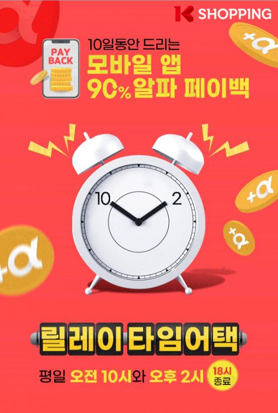 [아시아경제 임춘한 기자] K쇼핑은 오는 16일까지 모바일 앱을 통해 릴레이 타임어택 상품 구매 시 구매 금액의 90%를 적립금으로 지급하는 행사를 진행한다고 13일 밝혔다.