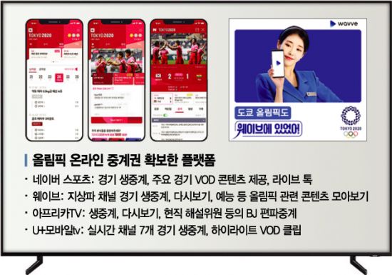 도쿄올림픽은 지상파 방송사 외에도 지상파에 중계권료를 지불한 OTT·포털 플랫폼이 온라인 중계사업자로 가세했다. 국내 대표 포털플랫폼인 네이버(네이버 스포츠) 외에 OTT 웨이브, 아프리카TV, LG유플러스(U+모바일tv)가 온라인 중계권을 최종 확보한 상태다. 이들 플랫폼은 이날 오후 8시 개막식을 시작으로 다음 달 8일까지 올림픽 경기를 생생하게 전달하는 역할을 맡게 된다.