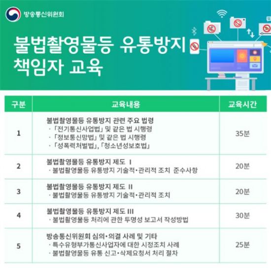 지난해 전기통신사업법과 정보통신망법 개정으로 인터넷사업자의 디지털성범죄물에 대한 삭제·유통방지 의무가 강화되면서 웹하드사업자와 일정 규모 이상의 부가통신사업자(사전조치의무사업자)의 경우 불법촬영물등 유통방지 책임자를 지정하고 매년 2시간 이상 법정 교육을 받아야 한다.